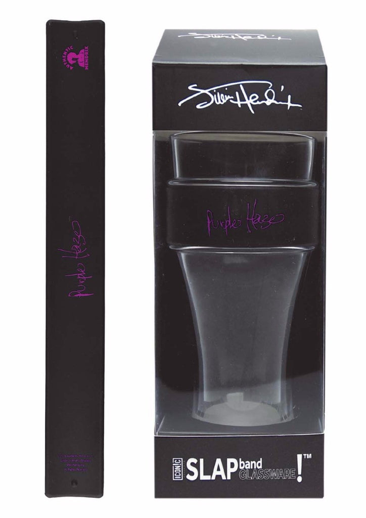 Check out this cool Jimi Hendrix pint glass! Each heavy duty glass weighs almost a heafty 1.5 pounds and features a removable "slap band" wrapped around the glass. Each slap band displays imagery from the band. Packed in retail packaging. These make great gifts for rock n roll fans!