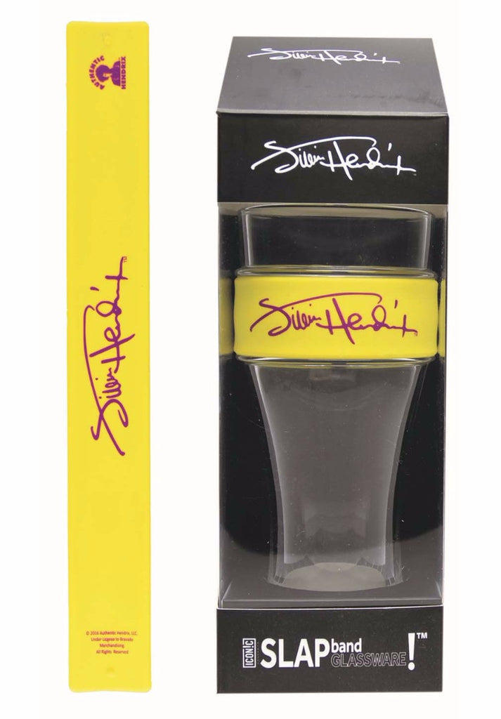 Check out this cool Jimi Hendrix pint glass! Each heavy duty glass weighs almost a heafty 1.5 pounds and features a removable "slap band" wrapped around the glass. Each slap band displays imagery from the band. Packed in retail packaging. These make great gifts for rock n roll fans!