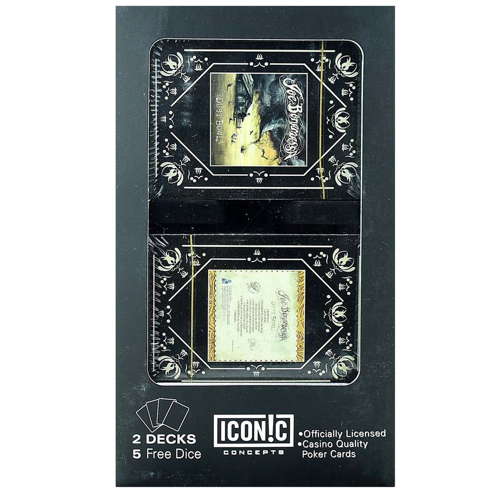 Check out these casino quality playing cards featuring imagery from blues icon Joe Bonamassa! Each playing card set features 2 packs of playing cards, 5 free dice and a sturdy aluminum window box tin to hold it all together. Officially licensed Joe Bonamassa merchandise.